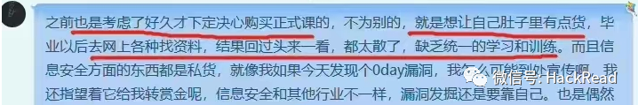 就像对方说的:“之前也是考虑了好久才下定决心购买正式课的,不为别的,就是想让自己肚子里有点货,毕业以后去网上各种找资料,结果回过头来一看,都太散了,缺乏统一的学习和训练。而且信息安全方面的东西都是私货,就像我如果今天发现个Oday漏洞,我怎么可能到处冒传啊,我还指望着它给我转赏金呢,信息安全和其他行业不一样,漏洞发掘还是要靠自己。”