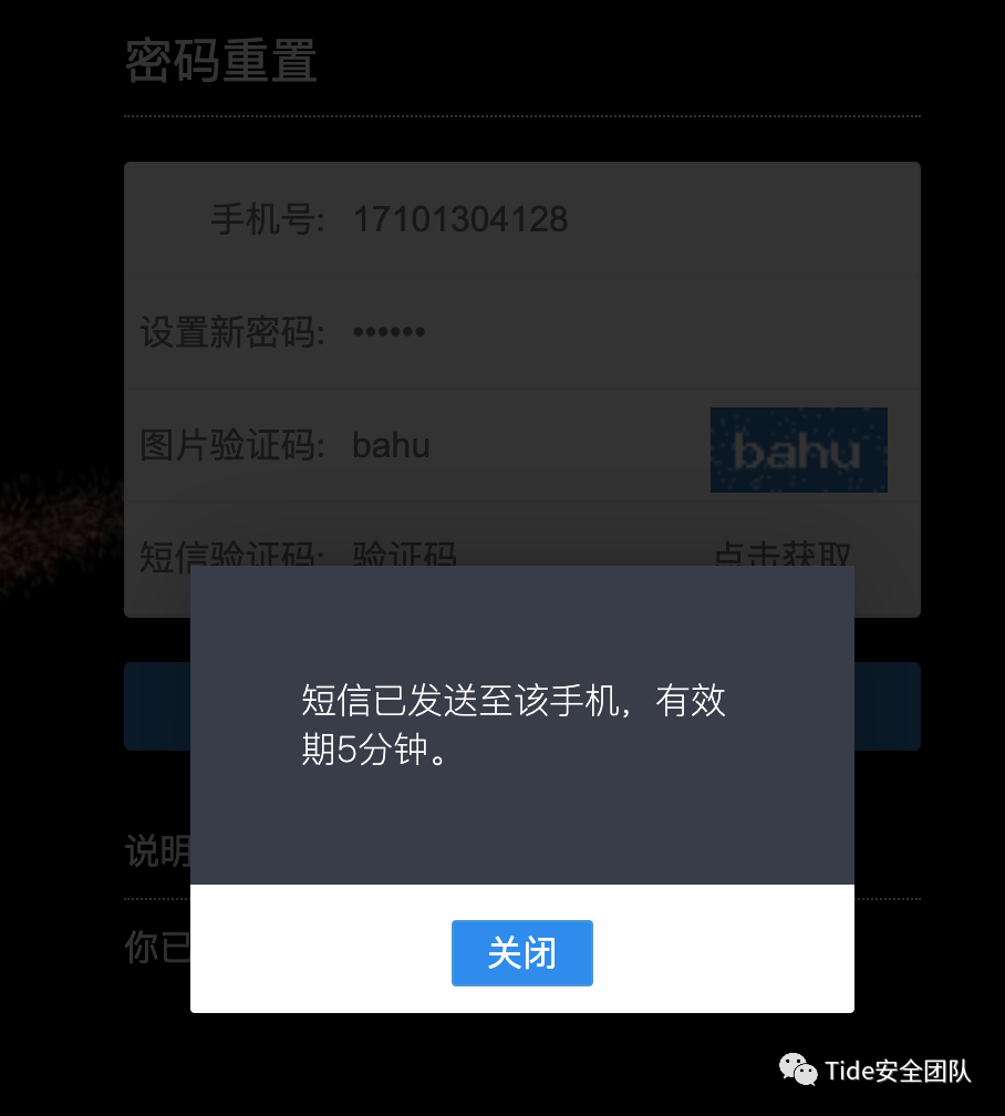 3. 重新打开一个页面进入密码重置界面,输入手机号17101304128,依次输入新密码等信息,获取验证码,系统提示已经发送验证码。由于不是自己的手机号,所以不知道验证码。