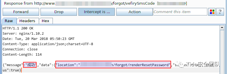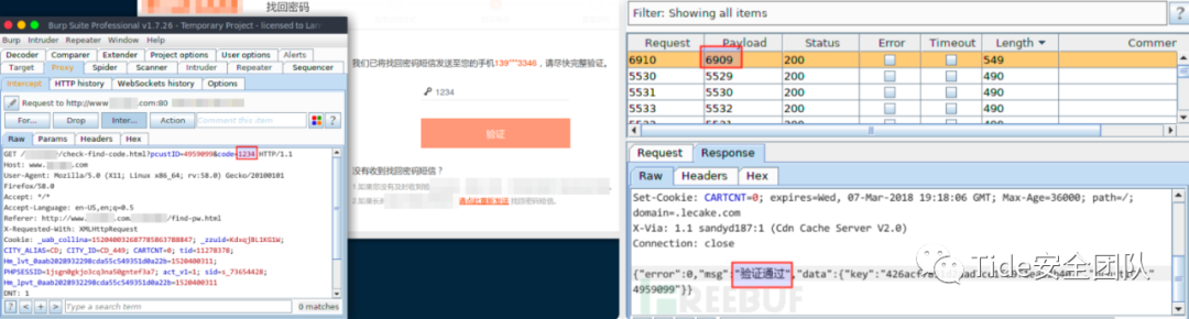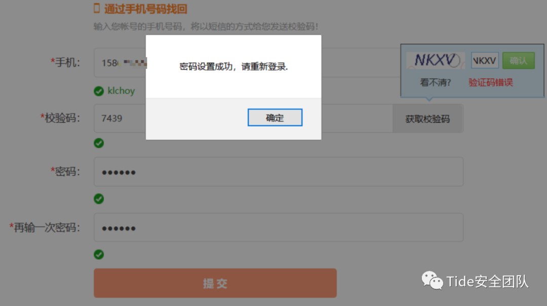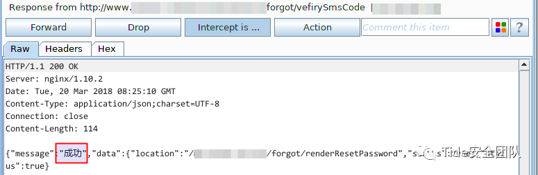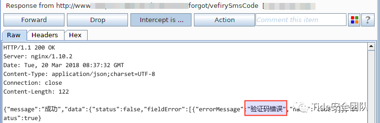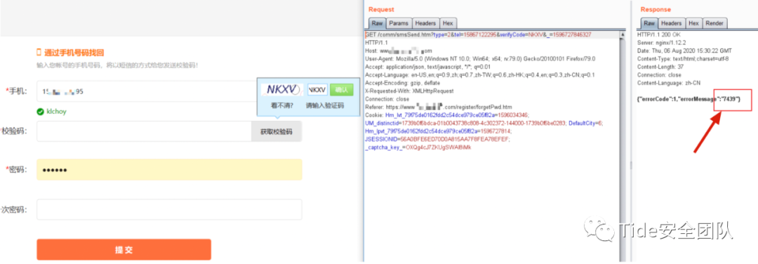 2. 密码找回页面显示需要通过手机号码找回,手机号码、校验码(图形验证码+短信验证码)、密码、再次输入密码是必填项。输入通过信息收集收集到的受害者手机号,点击【获取校验码】会先让用户输入图形验证码,这个验证码就只是为了验证是否是真人操作。正常输入图形验证码,点击【确认】时进行抓包,通过Response包能够直接看到短信验证码。