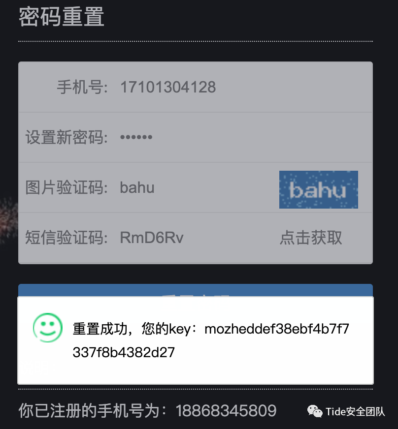 2. 根据提示得知我的手机号是18868345809。根据页面提示,依次填入手机号、新密码、图片验证码,单击【点击获取】后得到验证码RmD6Rv 。