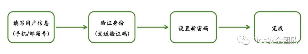 大多数密码重置的流程:重置密码过程一般是先验证注册的邮箱或者手机号或者用户名,获取重置密码的链接或者验证码,然后访问重置密码链接或者输入验证码,最后输入新密码。