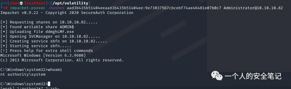最终借助 impacket-psexec 工具,成功已 Administrator 账号 hash 登陆目标服务器。
