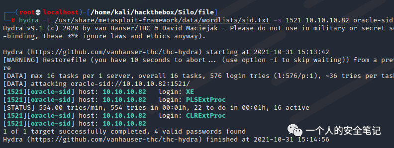 $ hydra -L /usr/share/metasploit-framework/data/wordlists/sid.txt -s 1521 10.10.10.82 oracle-sid从枚举结果中可以得知 SID:XE 是存在的,随后运行所有脆弱性检测模块: