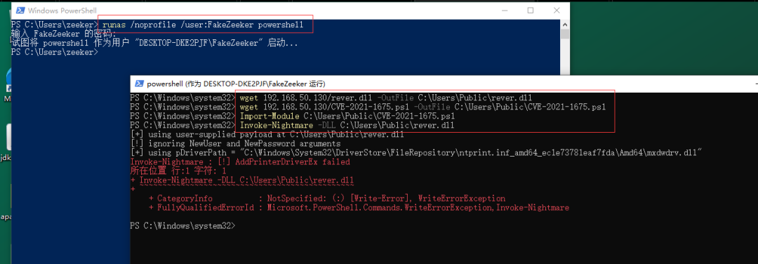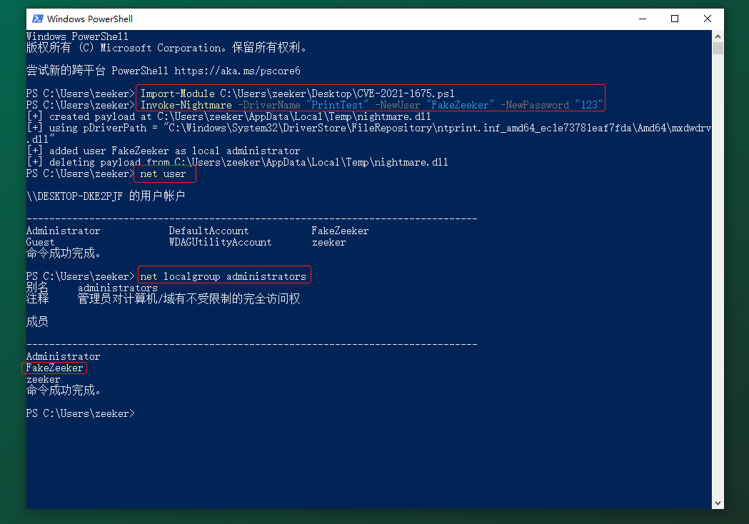 Invoke-Nightmare -DriverName "PrintTest" -NewUser "FakeZeeker" -NewPassword "123"运行后如下图所示: