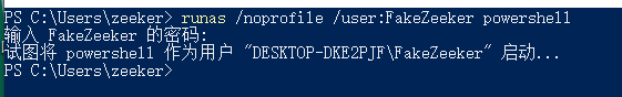 runas /noprofile /user:FakeZeeker powershell输入新创建的 FakeZeeker 用户的密码后即可以新用户身份打开powershell。