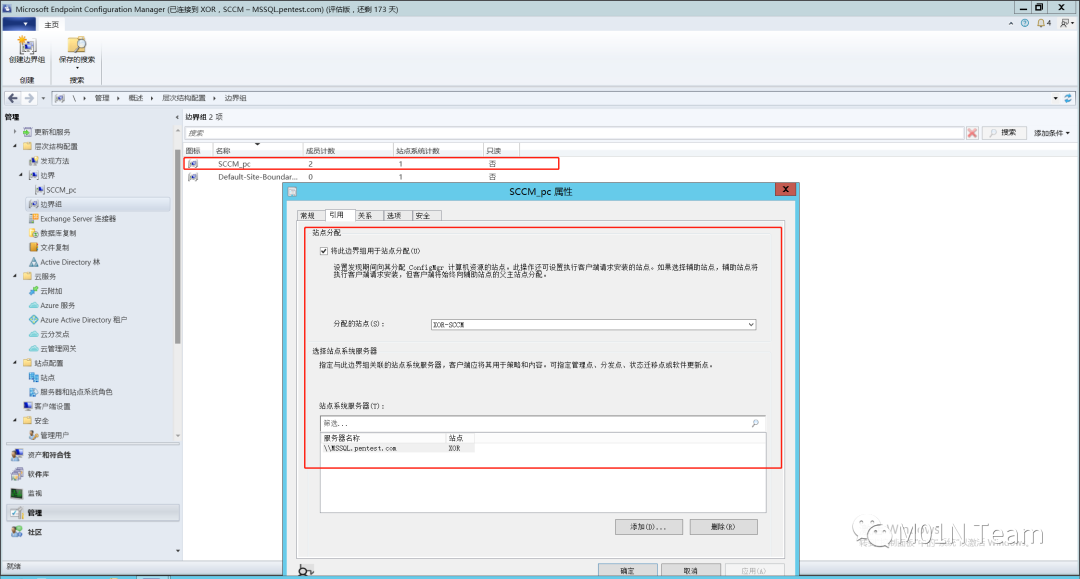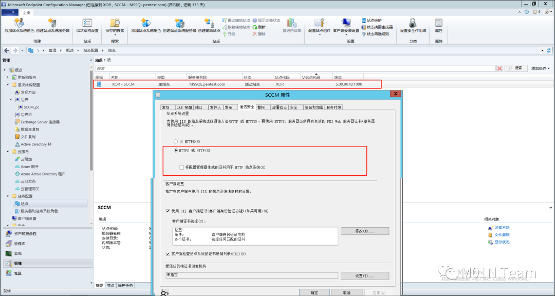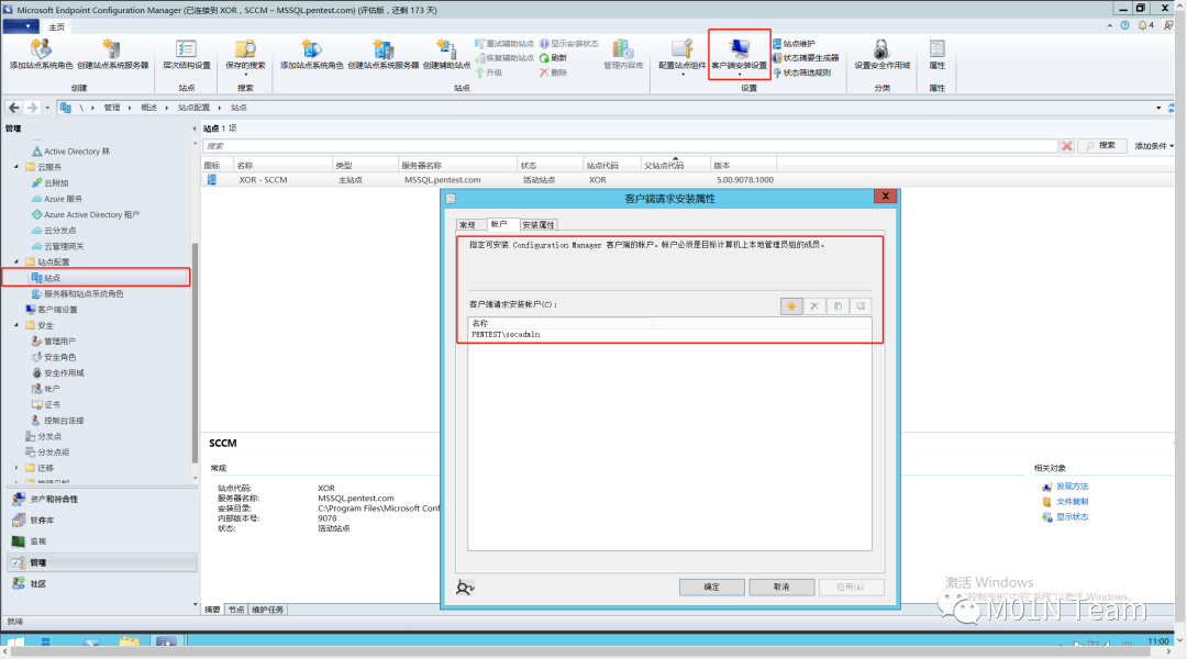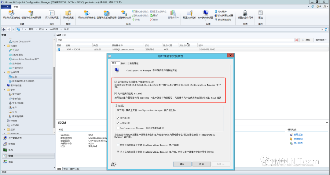 通过配置我们知道在环境中SCCM要对某个机器下发客户端安装需要通过WMI远程管理,使用配置的账户连接到目标主机的ADMIN$共享,这个配置账号必定是本地管理员组或者是Domain Admins组用户才能在工作组或域环境中对目标机器进行连接下发安装。就如下图,在站点MSSQL.pentest.com中客户端安装设置中的客户端请求安装属性账户必须是目标计算机上本地管理员组成员。