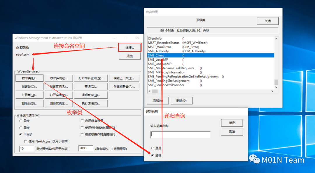 其原理是从wmi命名空间root\ccm去查询客户端注册相关信息,我们可以通过系统提供wbemtest(https://docs.microsoft.com/en-us/mem/configmgr/develop/core/understand/introduction-to-wbemtest)连接命名空间root\ccm枚举其中的类。