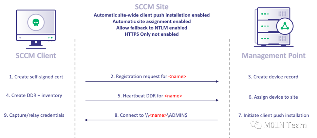 知道了上面这点,围绕获取这个配置账户的权限又有了如下攻击利用方式,SharpSCCM作者Mayyhem发现当SCCM启用自动站点分配和自动客户端推送安装,并且客户端身份验证不需要PKI证书时,可以将NTLM身份验证从管理点的安装和计算机账户强制转换为任意NetBIOS名称、FQDN或IP地址,允许凭据转发或破解,并且可以在任何Windows SCCM客户端上的低权限用户来完成。