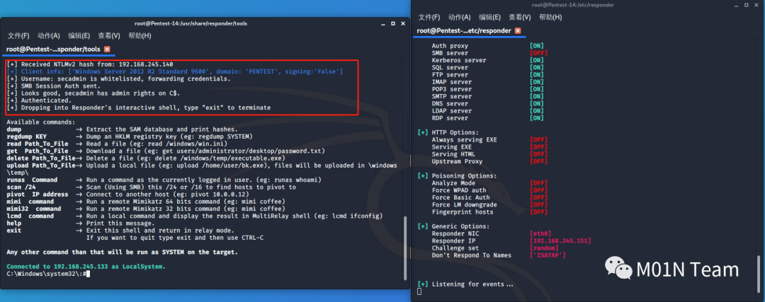 responder -I eth0 -rPv在使用SharpSCCM推送安装后151主机接收到NTLMv2 hash并中继给了133主机,133主机接收到中继的PENTEST\secadmin NTLMv2 hash后弹回shell