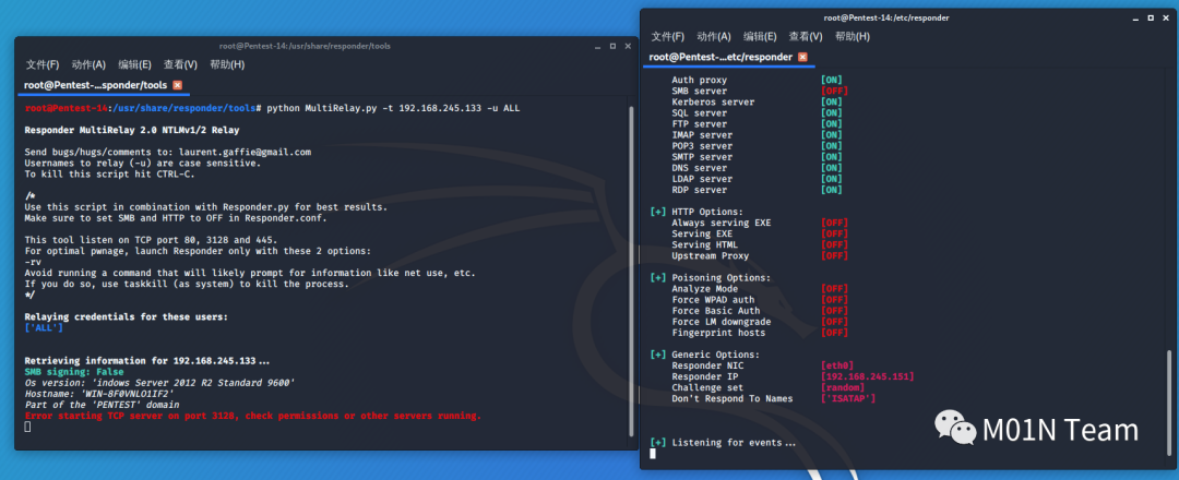 在151这台机器中使用responder(在配置文件中关闭SMB和HTTP接收开关)和MultiRelay设置中继服务器,并中继到133这台机器上
