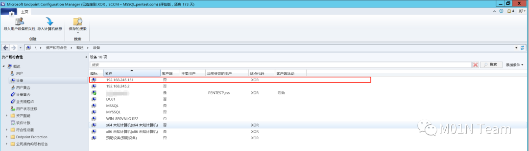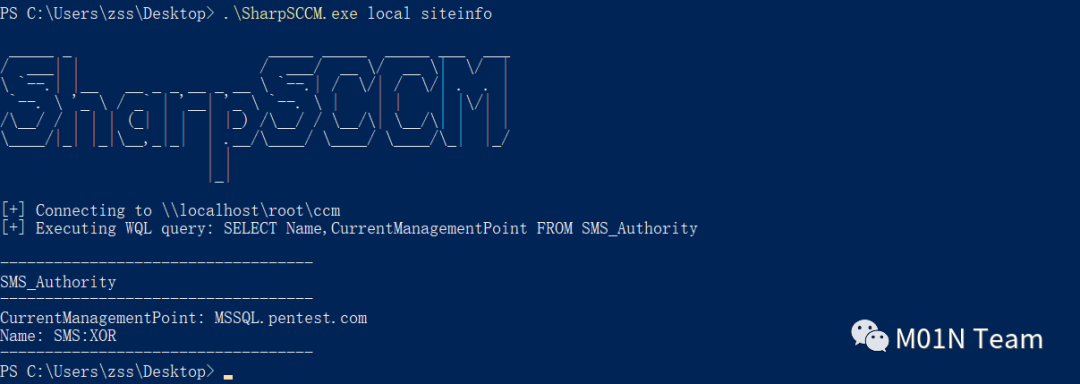 SharpSCCM.exe local siteinfoMSSQL.pentest.com是管理站点地址,XOR是站点代码。
