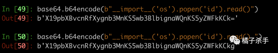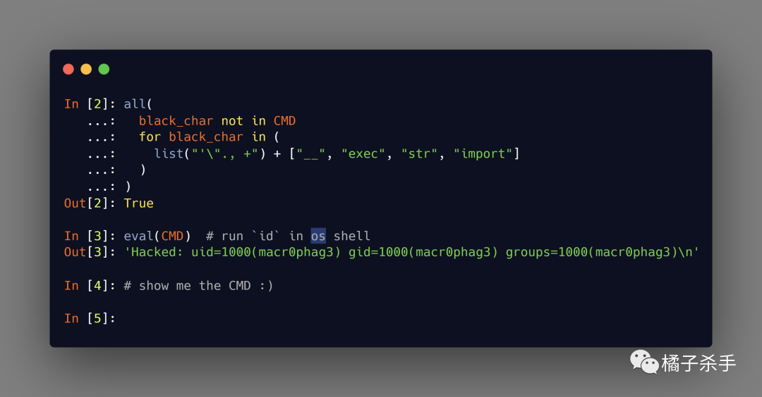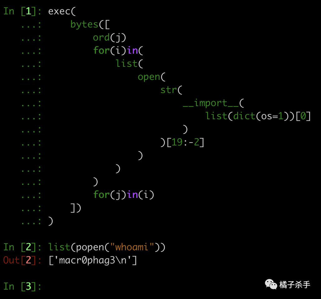 对 Python CTF 题比较熟悉的橘友,第一反应可能是用 list+dict:list(dict(whoami=1))[0]。这个 payload 还是比较好用的,但问题是,由于 whoami 作为参数名,无法携带一些特殊的字符,例如空格、引号、括号 等等,所以仅凭这个手法去构造的 exp,在实际的利用过程中不是非常实用。