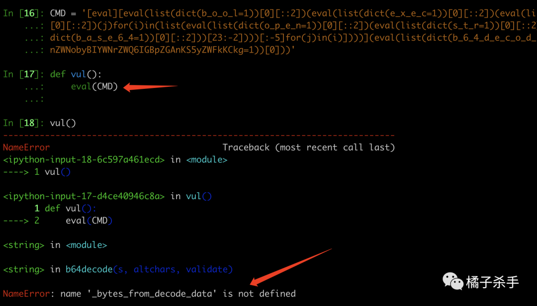 更进一步,这个 payload 里除了 eval、list、dict、for、in、数字 之外其他常量/函数/关键字都不是必要的。都可以用 eval + list + dict 构造。所以这个 payload 可以变成这样: