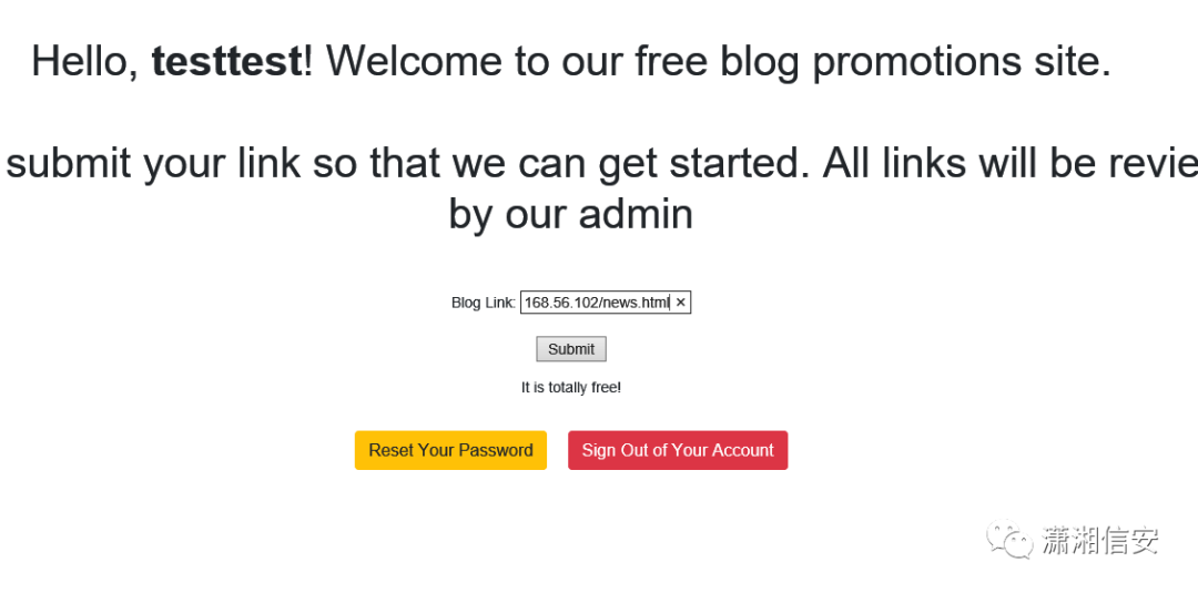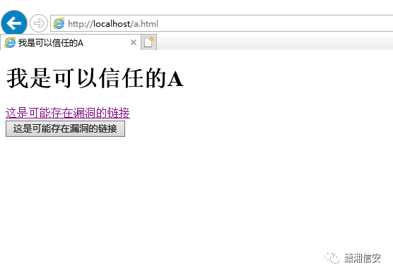 <!DOCTYPE html><html><meta charset="utf-8"><head><title>我是可以信任的A</title></head><body><h1>我是可以信任的A</h1><li><a href="http://localhost/b.html" target="_blank">这是可能存在漏洞的链接</a></li><button onclick="window.open('http://localhost/b.html')">这是可能存在漏洞的链接</button></body></html>