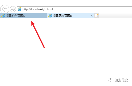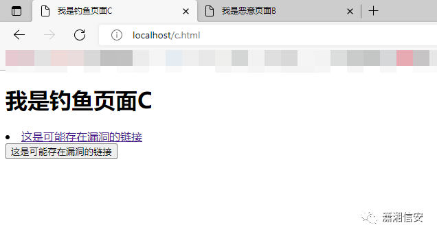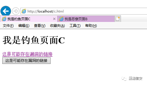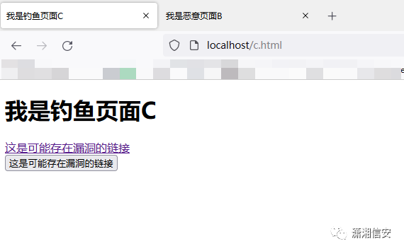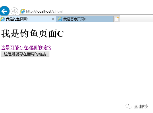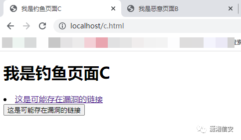 <!DOCTYPE html><html><meta charset="utf-8"><head><title>我是钓鱼页面C</title></head><body><h1>我是钓鱼页面C</h1><li><a href="http://localhost/b.html" target="_blank">这是可能存在漏洞的链接</a></li><button onclick="window.open('http://localhost/b.html')">这是可能存在漏洞的链接</button></body></html>