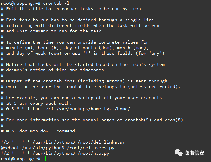 根据描述可以看到每五分钟会删除所提交的链接,每次重启会删除注册的用户,每两分钟会执行nap.py脚本。