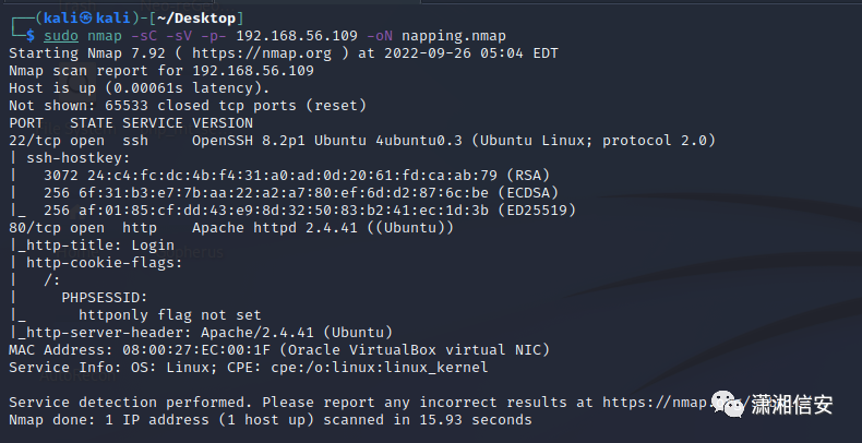 sudo nmap -sC -sV -p- 192.168.56.109 -oN napping.nmap-sC (默认脚本扫描,可以通过 nmap --script-help "default" 来查看默认脚本)Performs a script scan using the default set of scripts. It is equivalent to --script=default. Some of the scripts in this category are considered intrusive and should not be run against a target network without permission.-sV (版本检测,-sR是-sV的别名)Enables version detection, as discussed above. Alternatively, you can use -A, which enables version detection among other things.-p (扫描特定端口,-p- 表示扫描1-65535端口)This option specifies which ports you want to scan and overrides the default. Individual port numbers are OK, as are ranges separated by a hyphen (e.g. 1-1023). The beginning and/or end values of a range may beomitted, causing Nmap to use 1 and 65535, respectively. So you can specify -p- to scan ports from 1 through 65535. Scanning port zero is allowed if you specify it explicitly. For IP protocol scanning (-sO), this optionspecifies the protocol numbers you wish to scan for (0–255).When scanning a combination of protocols (e.g. TCP and UDP), you can specify a particular protocol by preceding the port numbers by T: for TCP, U: for UDP, S: for SCTP, or P: for IP Protocol. The qualifier lasts untilyou specify another qualifier. For example, the argument -p U:53,111,137,T:21-25,80,139,8080 would scan UDP ports 53, 111,and 137, as well as the listed TCP ports. Note that to scan both UDP and TCP, you have to specify-sU and at least one TCP scan type (such as -sS, -sF, or -sT). If no protocol qualifier is given, the port numbers are added to all protocol lists. Ports can also be specified by name according to what the port isreferred to in the nmap-services. You can even use the wildcards * and ? with the names. For example, to scan FTP and all ports whose names begin with “http”, use -p ftp,http*. Be careful about shell expansions andquote the argument to -p if unsure.Ranges of ports can be surrounded by square brackets to indicate ports inside that range that appear in nmap-services. For example, the following will scan all ports in nmap-services equal to or below 1024: -p [-1024].Be careful with shell expansions and quote the argument to -p if unsure.-oN (文件输出)Requests that normal output be directed to the given filename. As discussed above, this differs slightly from interactive output.