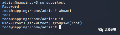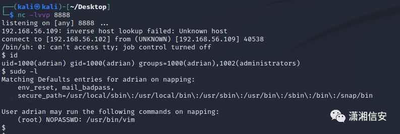 python3 -c 'import pty;pty.spawn("/bin/bash")'## 本地终端查看当前终端环境变量(kali㉿kali)-[~/Desktop] $ echo $TERMxterm-256color## 目标shell 配置环境变量adrian@napping:~$ export TERM=xterm-256coloradrian@napping:~$ export SHELL=/bin/bash## 本地终端查看终端行和列(kali㉿kali)-[~/Desktop] $ stty size24 103## 目标shell中## ctrl+z将任务存入后台返回本地终端adrian@napping:~$ ^Z[1]+ Stopped nc -lvp 9091## 本地终端执行以下命令将终端设置为回显输入字符,以便它被受害者终端会话捕获。按照命令fg将之前存入后台的任务恢复到前台。(kali㉿kali)-[~/Desktop] $ stty raw -echo;fg##之后,您的光标可能位于终端中间的某个位置,键入reset以重置受害者终端会话。reset## 目标shell中您需要指定带有行和列的“新”终端以使其正确显示。adrian@napping:~$ stty rows 24 columns 103完成