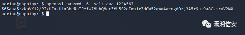 $id$salt$encryptedid表示加密算法,1代表MD5,5代表SHA-256,6代表SHA-512 目前基本上都使用sha-512算法的,但无论是md5还是sha-256都仍然支持。salt表示密码学中的Salt,系统生成encrypted表示密码的hashopenssl passwd -6 -salt aaa 1234567passwdGeneration of hashed passwords.-6Use the SHA256 / SHA512 based algorithms defined by Ulrich Drepper.-salt stringUse the specified salt. When reading a password from the terminal, this implies -noverify.