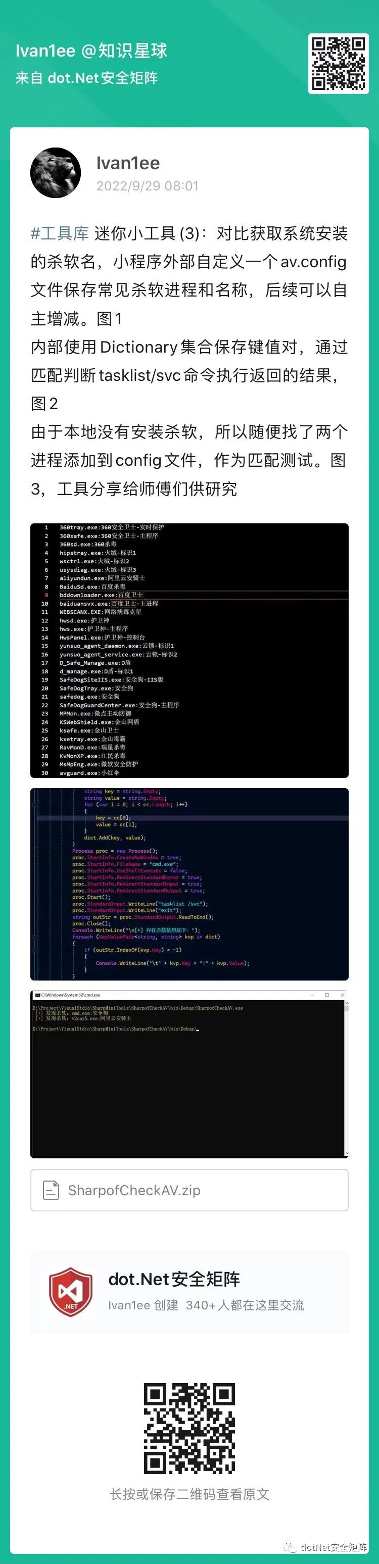 星球汇聚了各行业安全攻防技术大咖,并且每日分享.NET安全技术干货以及交流解答各类技术等问题,社区中发布很多高质量的.NET安全资源,可以说市面上很少见,都是干货。其中主题包括.NET Tricks、漏洞分析、内存马、代码审计、预编译、反序列化、webshell免杀、命令执行、C#工具库等等,后续还会倾力打造专刊、视频等配套学习资源,循序渐进的方式引导加深安全攻防技术提高以及岗位内推等等服务。