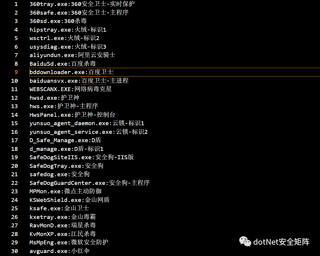 对比获取系统安装的杀软名,小程序外部自定义一个av.config文件保存常见杀软进程和名称,后续为了方便维护可以自主增减。