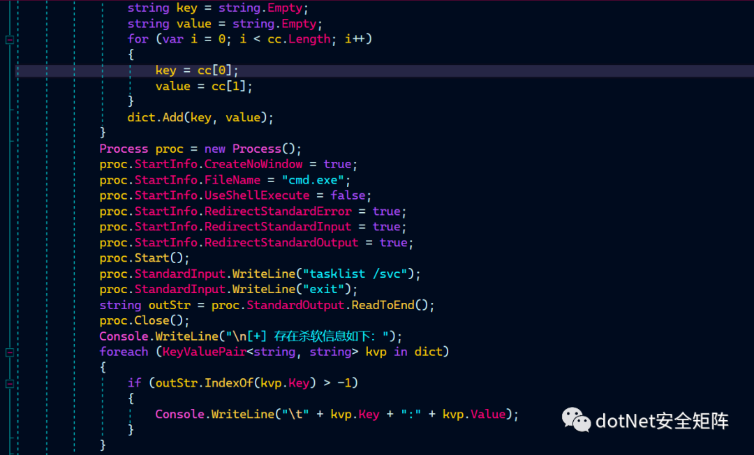 内部使用Dictionary集合保存键值对,通过匹配判断tasklist/svc命令执行返回的结果,实现代码如下