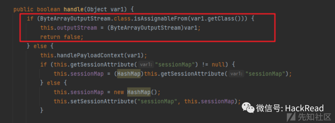 handle():其实现如下,可以看到当传入的参数是ByteArrayOutputStream对象或者是其子类的时候,会将该对象赋给类中的outputStream对象,然后reture false结束。