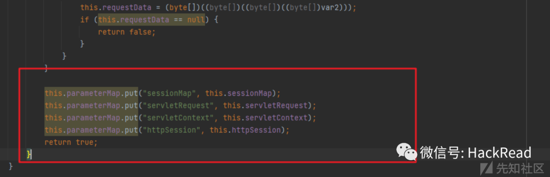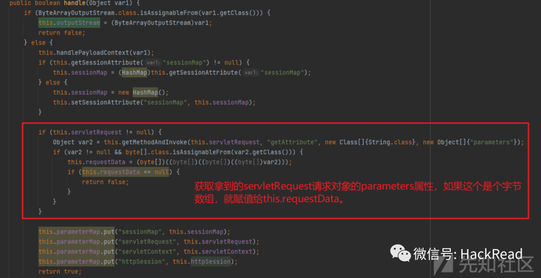继续回到handle方法里面,下面是往一个map里面放了几个要用的对象,然后返回true: