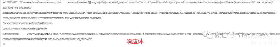 上的响应流量中,其实也不好判断,乍一看能看到个前面是PK...,像是个zip文件的头,后面也没有可读性,所以也不能判断出来