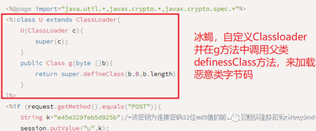 也是我们现在研究的webshell里面base64硬编码的恶意类也继承Classloder并重写方法调用defineClass的原因