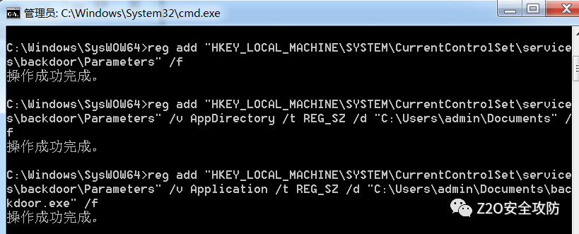 reg add "HKEY_LOCAL_MACHINE\SYSTEM\CurrentControlSet\services\backdoor\Parameters" /f