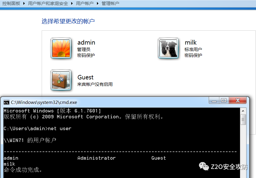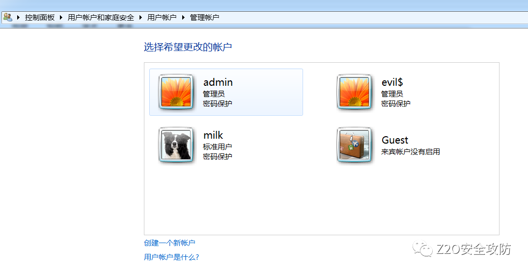 regedit /s 3.reg查看效果,现在使用net user命令和控制面板均看不到 evil$ 用户