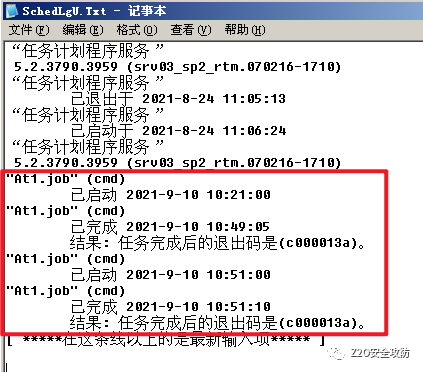 在日志C:\WINDOWS\Tasks\SchedLgU.txt中排查可疑的定时任务记录