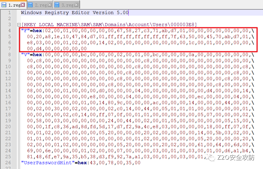 然后将 2.reg 的 F 值替换为 1.reg 的F值,即将 evil$ 用户的 F 值替换为 admin 用户的 F 值