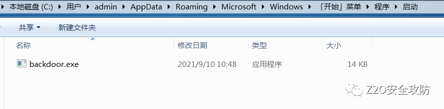 C:\ProgramData\Microsoft\Windows\Start Menu\Programs\StartUp将后门程序放到上面的用户目录中,目标用户重新登录时便会启动后门程序。