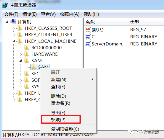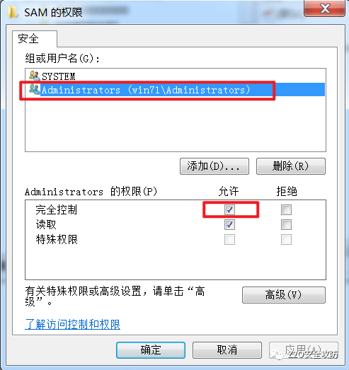 所以,我们还需要在注册表中进行一些操作,需要更改的注册表键值为HEKY_LOCAL_MACHINE\SAM\SAM\Domains\Account\Users,默认情况下,HEKY_LOCAL_MACHINE\SAM\SAM的内容只有system用户才能查看和修改,所以,我们要赋予当前用户完全控制的权限